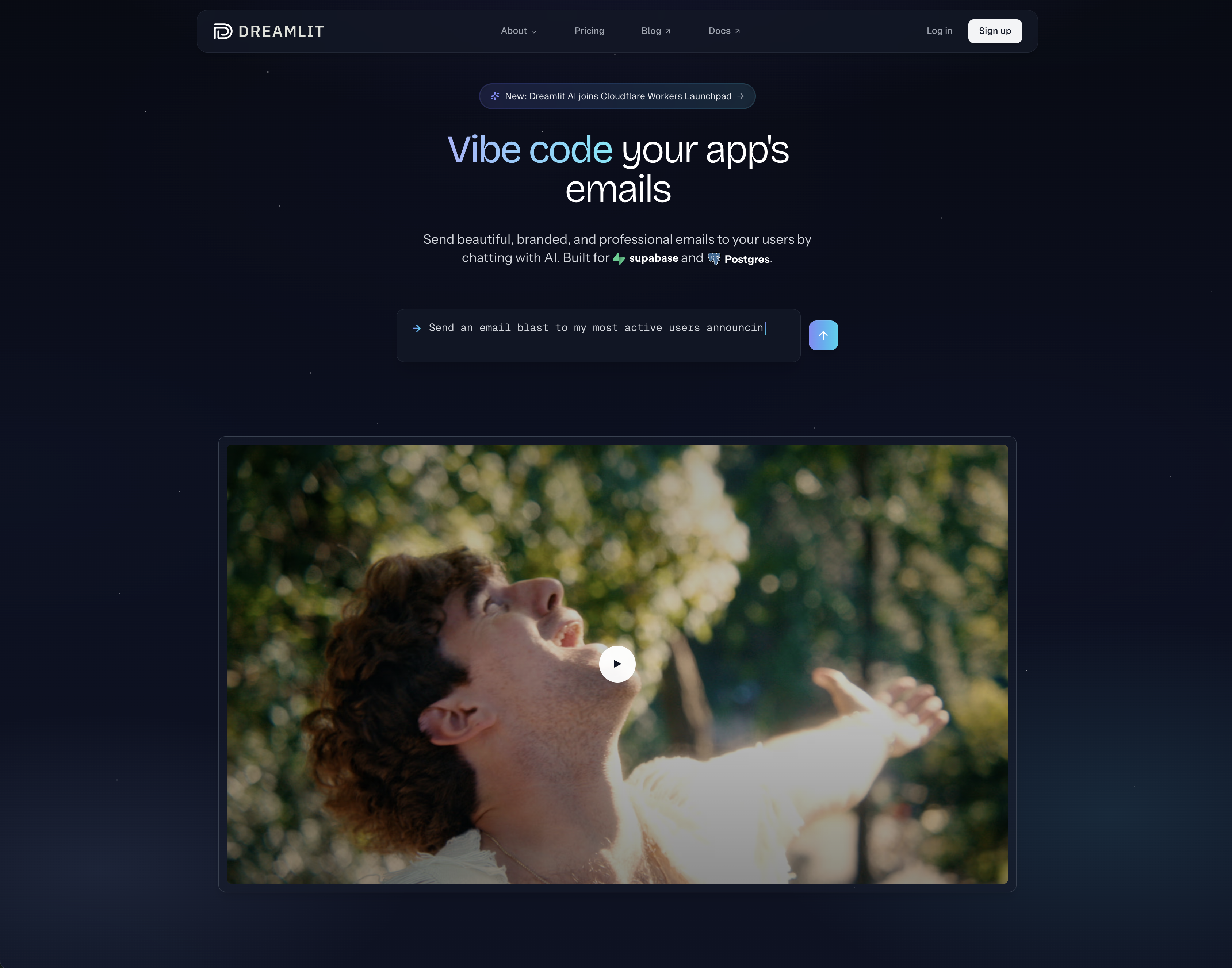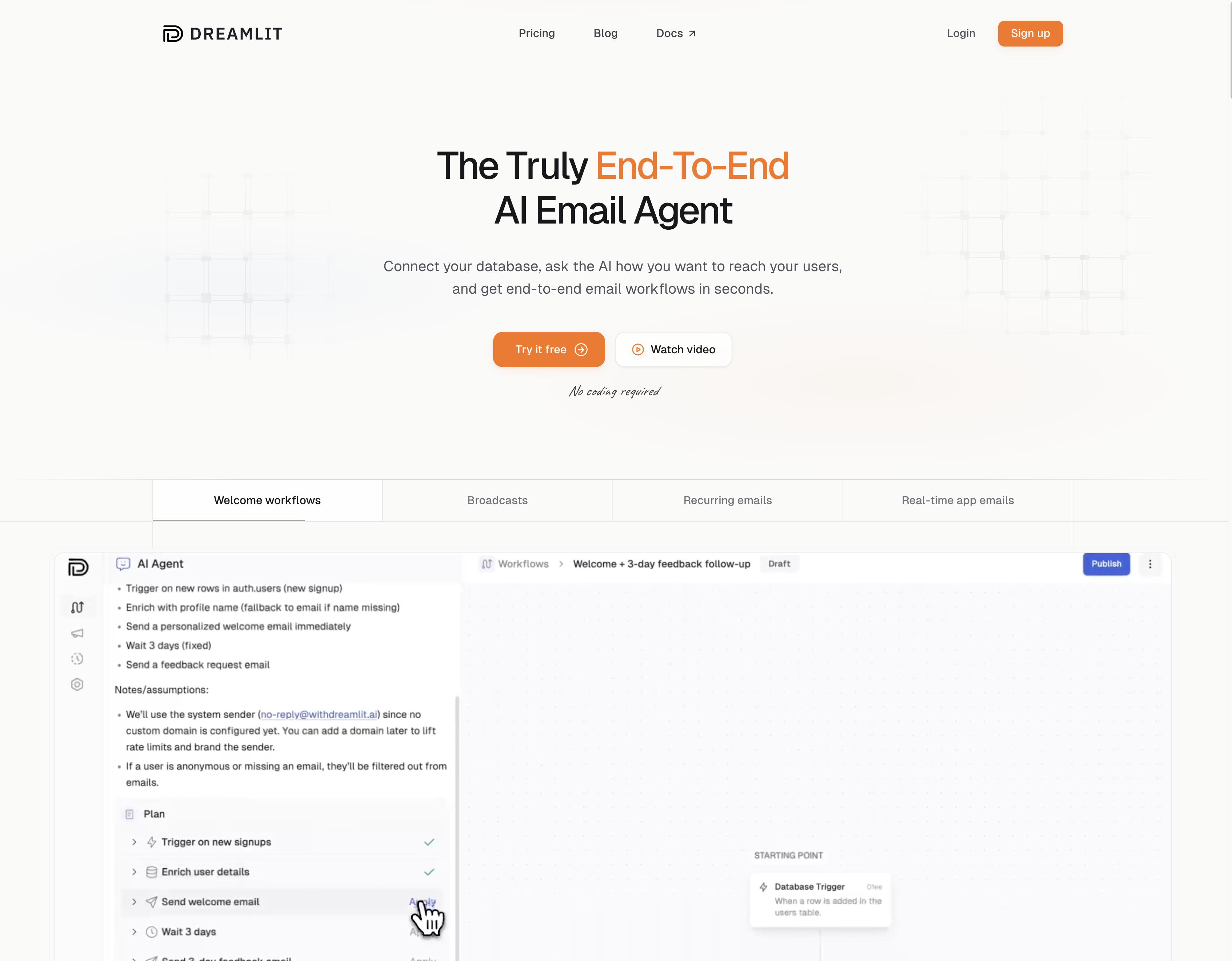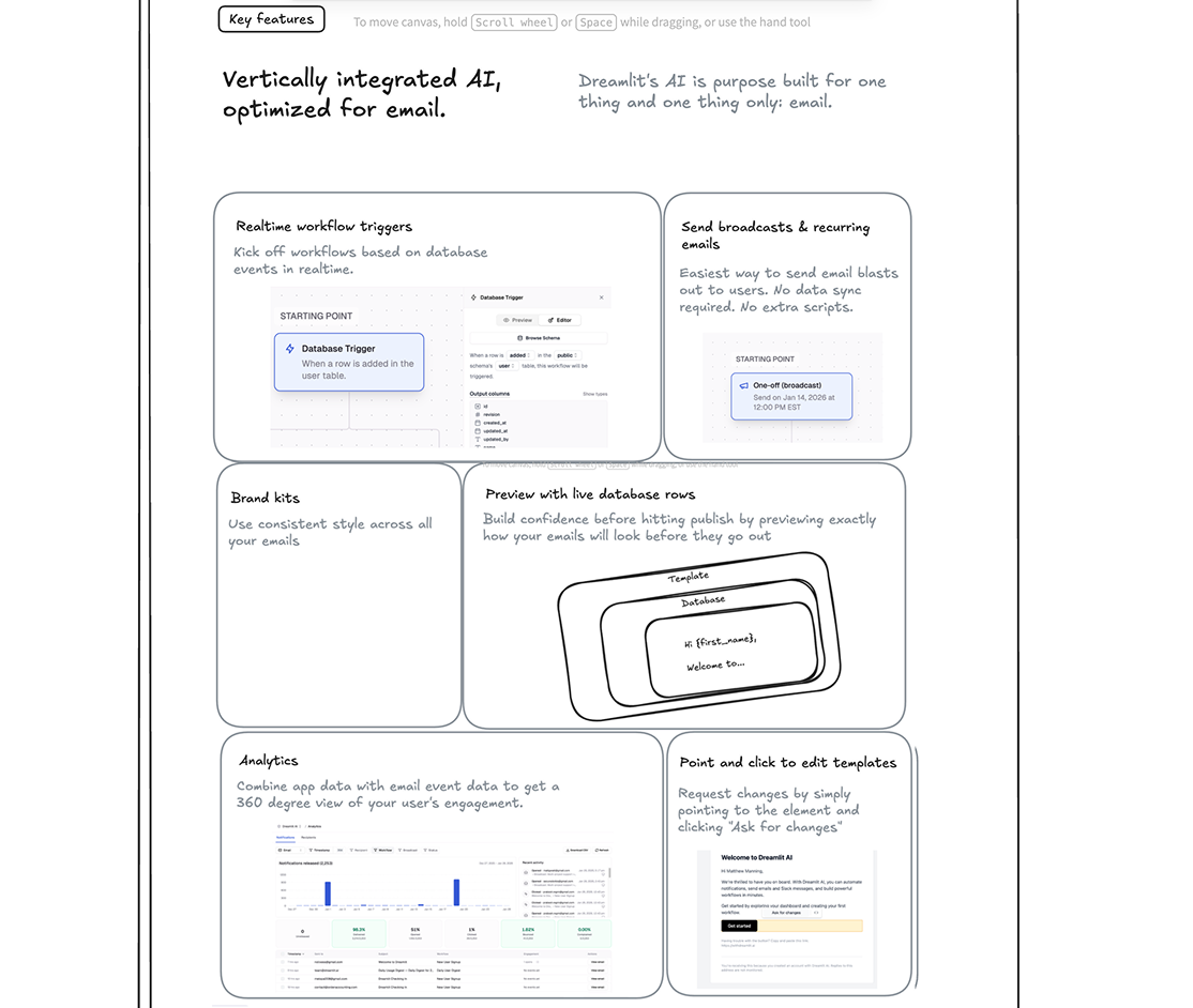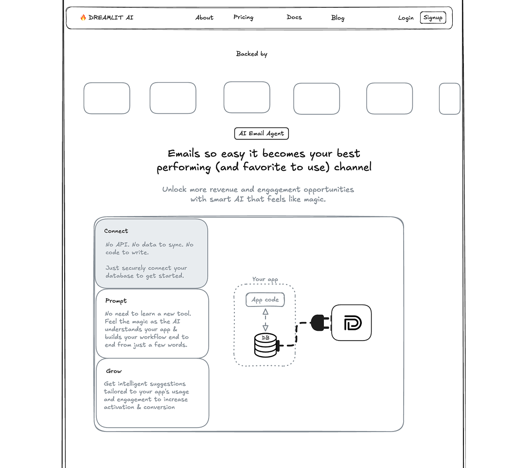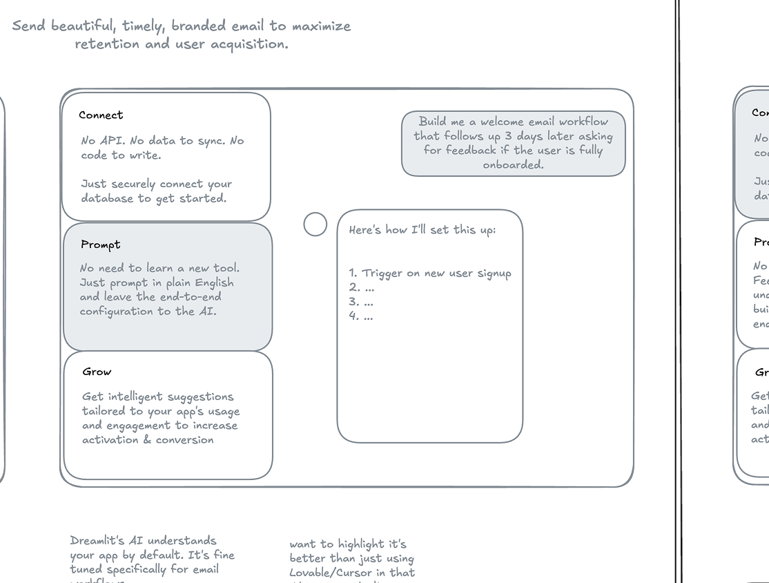 For Dreamlit, that's being the easiest way to send emails with AI. We wanted to highlight that, along with our unique database-driven approach (no app code integration required). We landed on the tagline The Truly End-To-End AI Email Agent, with the subtext: "Connect your database, ask the AI how you want to reach your users, and get end-to-end email workflows in seconds."